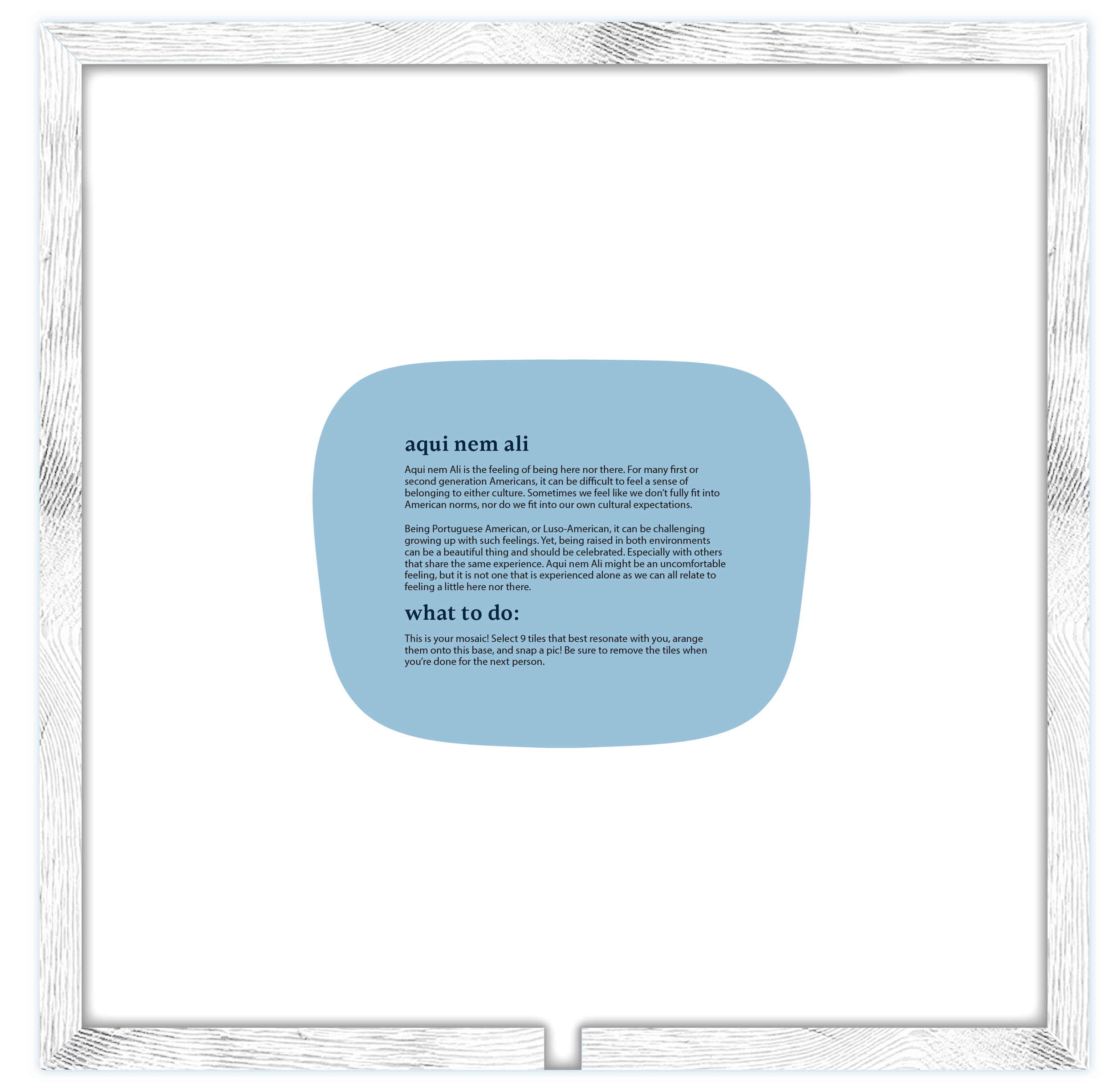 Aqui Nem Ali is a hands on installation designed to engage the public in exploring and understanding biculturalism. Centered around themes of Portuguese American heritage, the installation provides viewers with a selection of 20 tiles. Visitors are encouraged to select and arrange 9 tiles that resonate with them or evoke a sense of charm, thereby crafting their personalized azulejo mosaic.